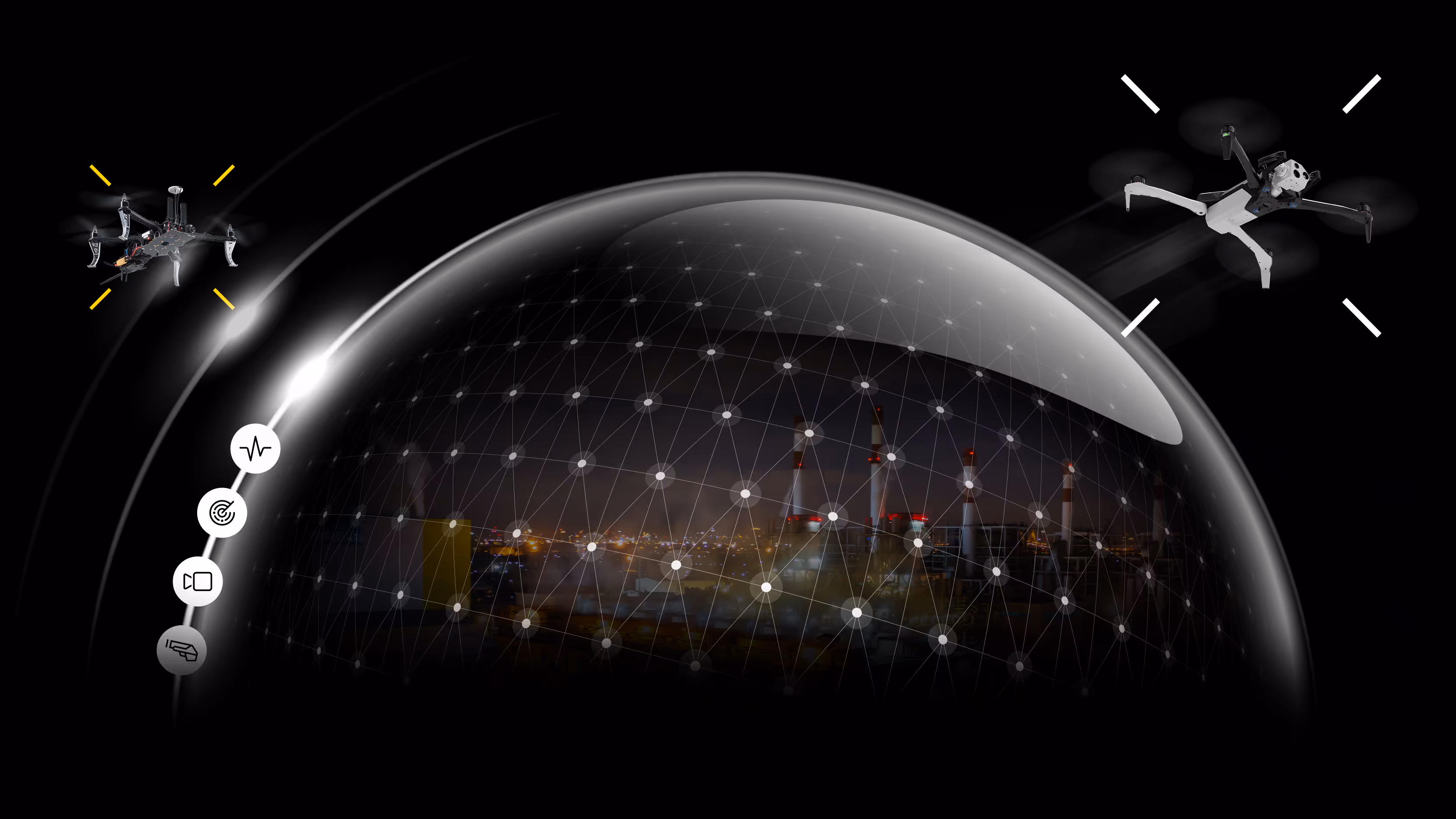 The dome as Dedrone's key visual instinctively signals protection to the human mind. From an early age, safety is learned as something that comes from being covered: the first enclosed space we ever experience, a helmet over the head, a roof over a house.